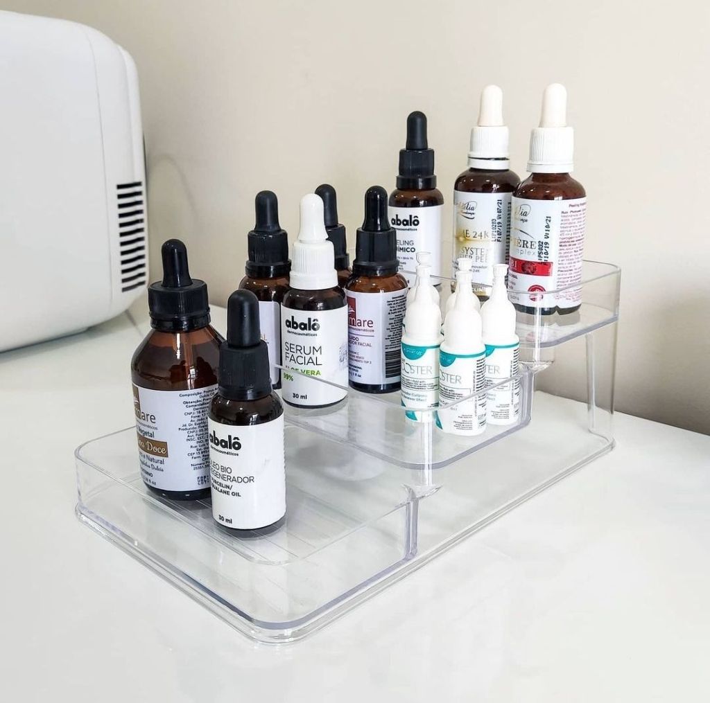 Esse organizador você pode ordenar por setores: peeling/ sérum/ óleos / monodoses. Fica muito bonito, exposto na bancada. Para comprar clique aqui!