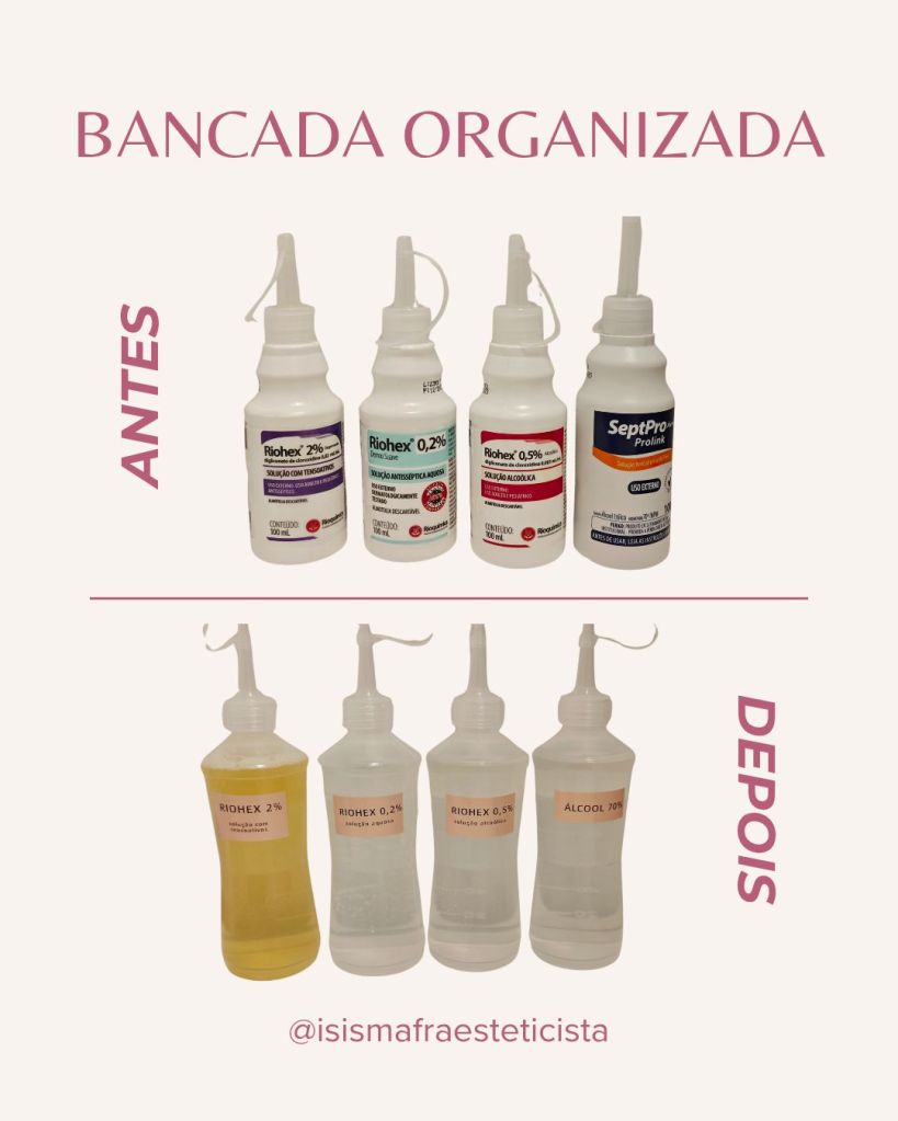 Vocês sabem que eu gosto de bancada organizada e sem muitas informações. Nessa semana troquei as embalagens de alguns produtos antissépticos que usamos em todos os atendimentos da clínica.