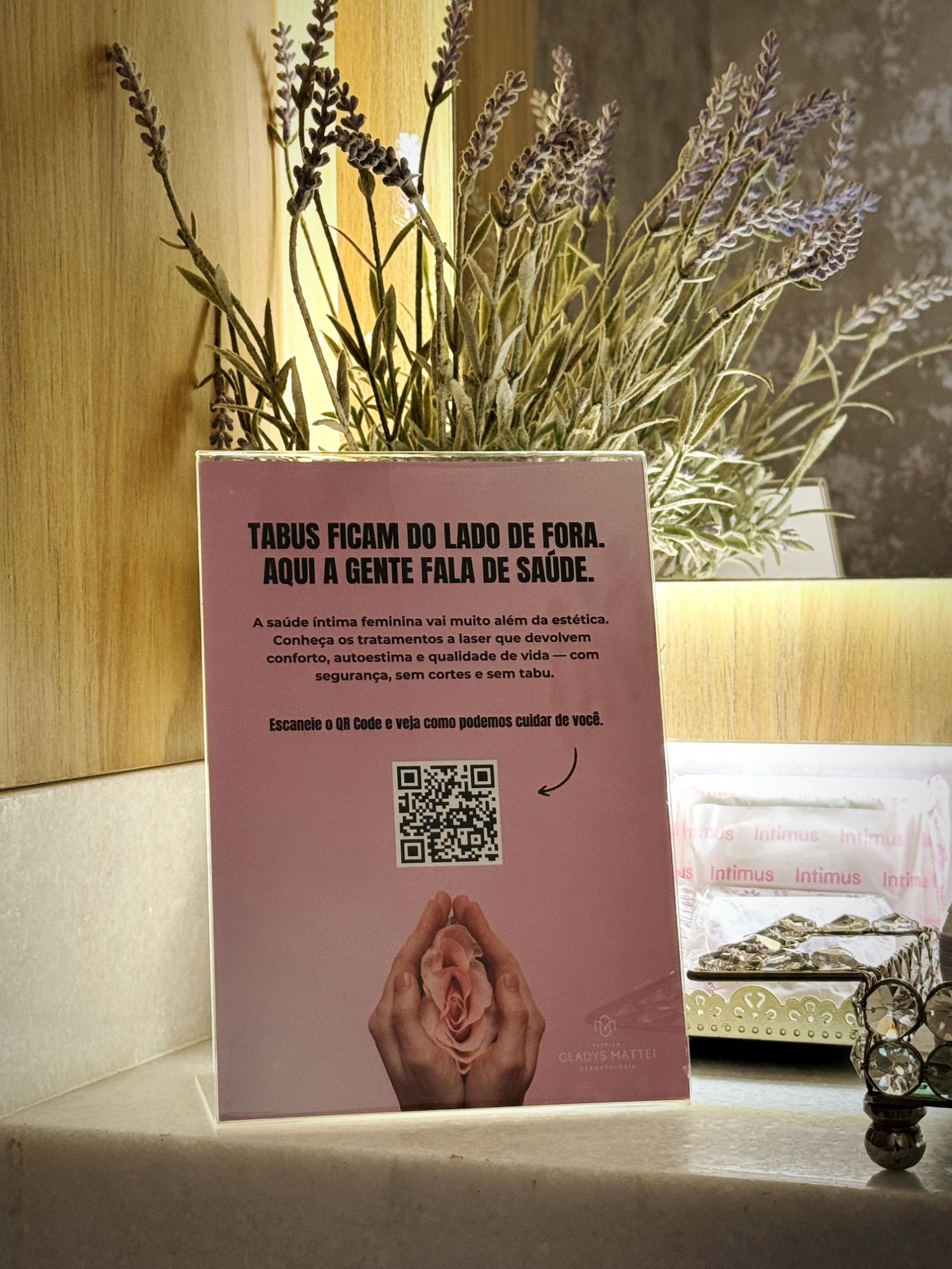 E para facilitar o acesso, desenvolvi um banner com QR Code que está disponível em pontos estratégicos da clínica — inclusive no banheiro, onde muitas pacientes se sentem mais à vontade para acessar.