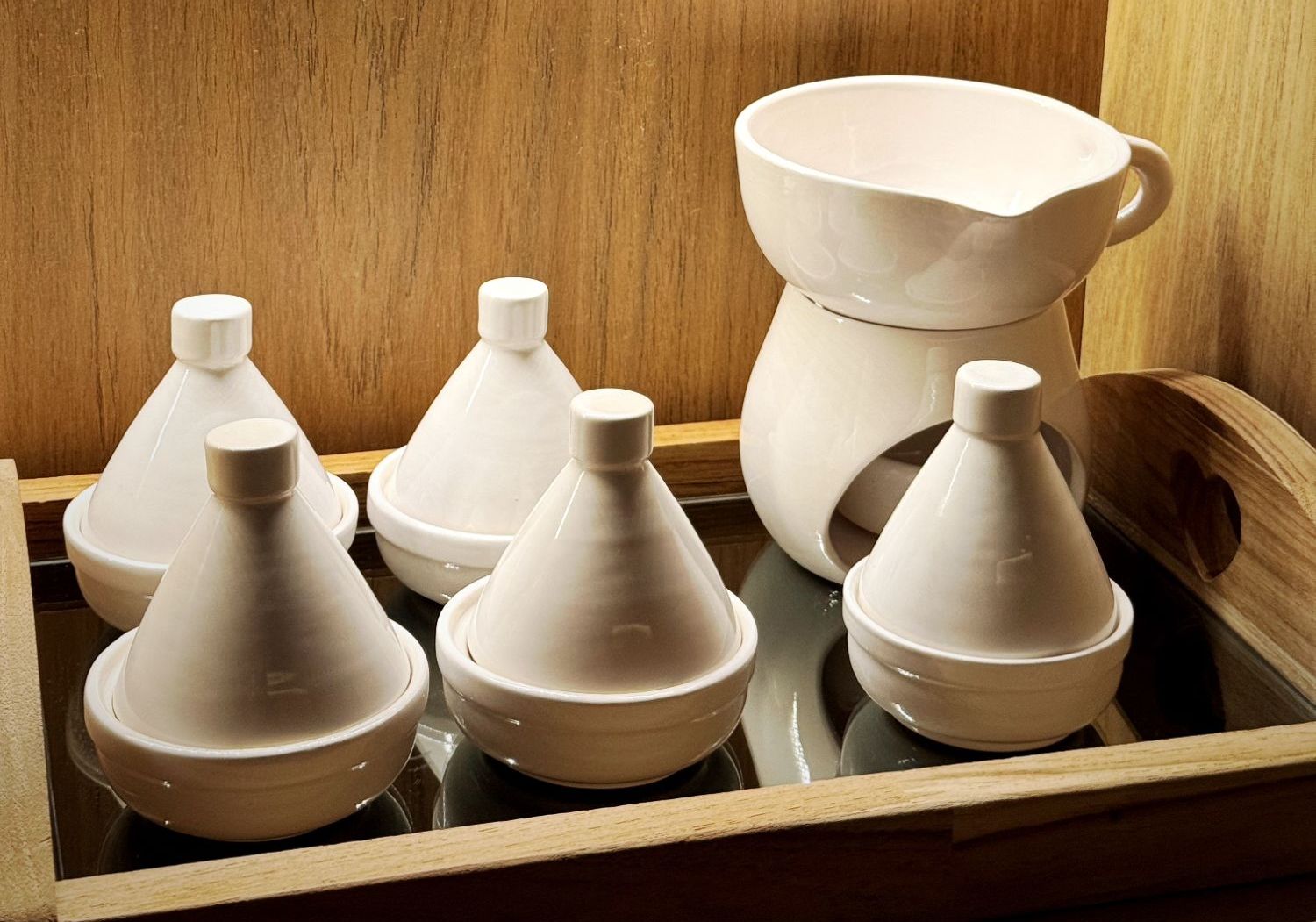Para a clínica, escolhi esses tajines* — potes de cerâmica com tampa cônica — que possuem um disco cerâmico em seu interior onde pingamos os óleos essenciais. Assim, o paciente pode sentir cada fragrância de forma delicada e personalizada, ao receber a tampa nas mãos para apreciar os aromas.